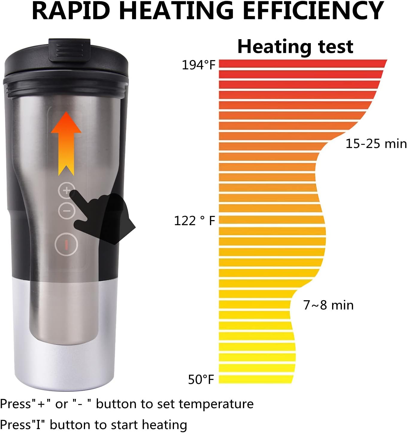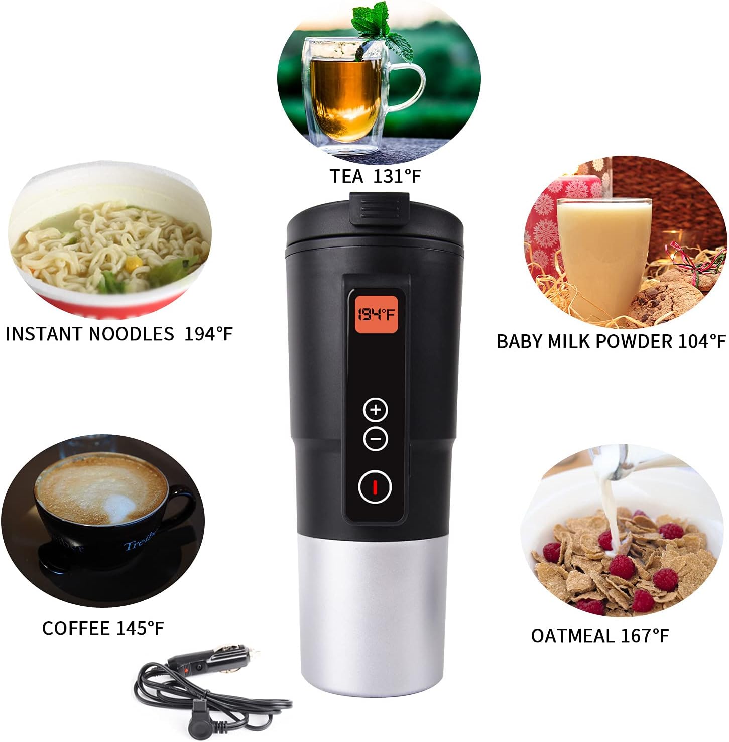 Chauffage Rapide : Avec une capacité de 13 oz et une puissance de 60W, la tasse chauffe une tasse d’eau à température ambiante à 194°F en seulement 15-25 minutes. Ne manquez pas votre café matinal !