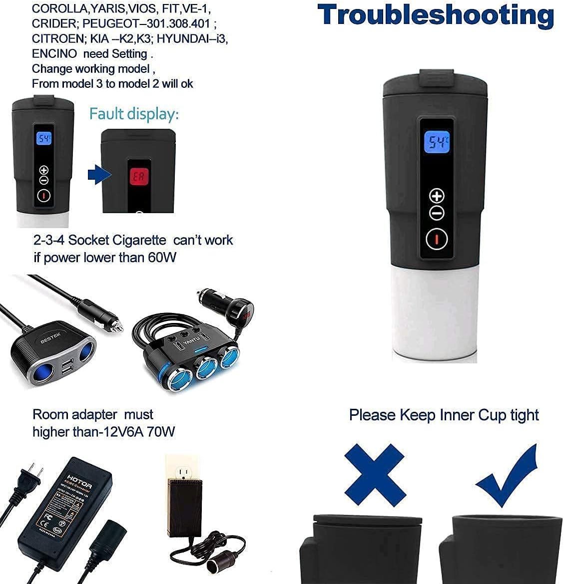 Attention à la Compatibilité : Assurez-vous d’utiliser cette tasse exclusivement avec un système de 12V. Évitez de l’utiliser avec des bus ou camions 24V. Pour une expérience sans souci, utilisez un adaptateur approprié.