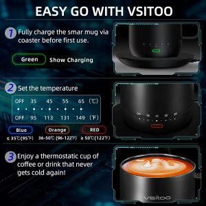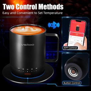 - Contrôle Pratique : Utilisez simplement le bouton intégré ou connectez-vous à l’application VSITOO pour personnaliser vos réglages de température et profiter de votre boisson comme vous l’aimez.