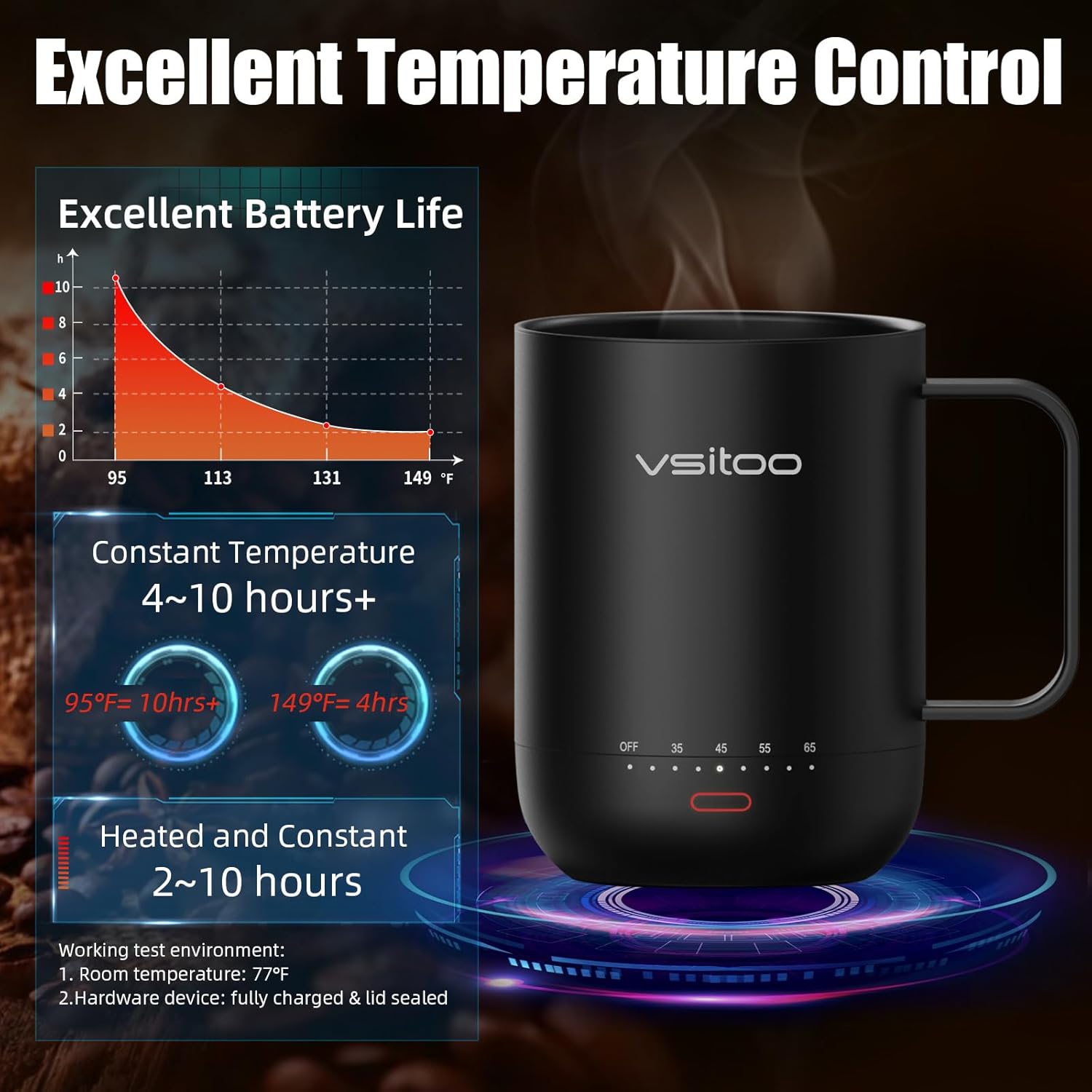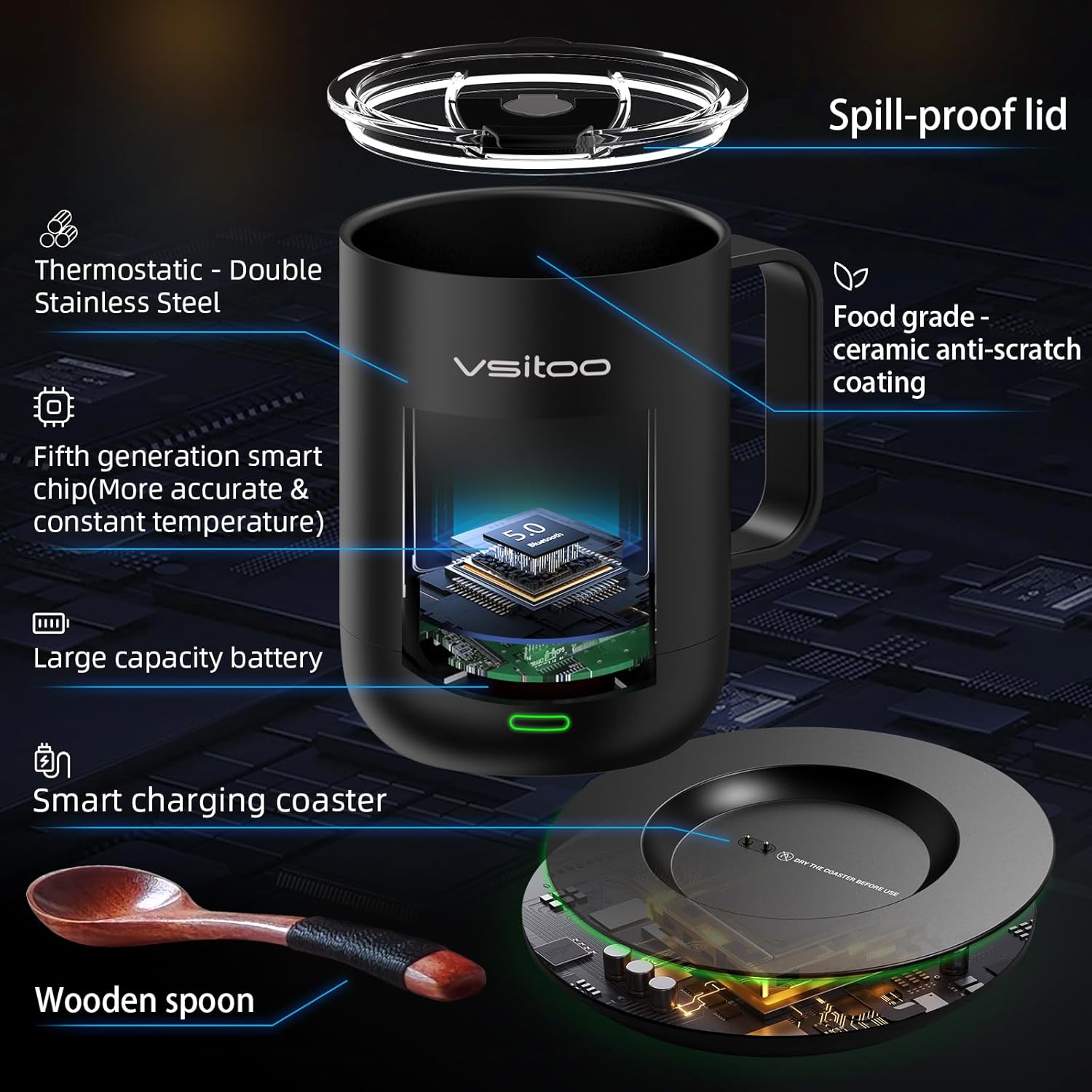 - Contrôle Pratique : Utilisez simplement le bouton intégré ou connectez-vous à l’application VSITOO pour personnaliser vos réglages de température et profiter de votre boisson comme vous l’aimez.
